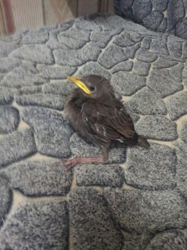 Starling , the yellow beak and the shape of the beak is different to that of a Baby Blackbird. Baby blackbirds are mottled brown, and the beak is not as yellow.